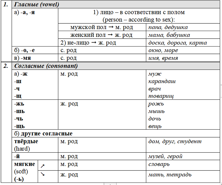 Как определить род существительного по конечным буквам? Изучите внимательно таблицу.