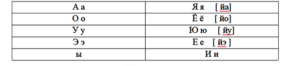 Й [й’] ай-ой-уй-эй-ый-ий Яя [й’а] а-я-я ям ял-як-яф Ее [й’э] е-ем-ет-ен-еф-ед Ёё [й’о] ё-ёл-ём-ён-ёт-ёт-ёф Юю [й’у] ю-юр-Юра-юл-Юля-юн-юк-юм-ют