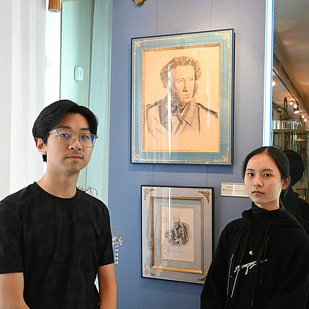 Э́то сестра́ и брат. Его́ зову́т Пётр. Он врач. Э́то его́ больни́ца. Э́то его́ сестра́. Её зову́т Ма́ша. Она́ музыка́нт. Она́ игра́ет на скри́пке. Здесь её музыка́льная шко́ла. Э́то их друзья́. Их зову́т Моде́ст и Ми́ша. Они́ студе́нты. Там их общежи́тие.