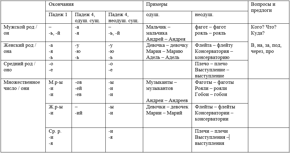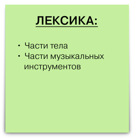 Динамика, фагот, лютня, такт, размер, голова, рука, кисть, плечо, нога, палец, ухо, автобус, скрипка, столовая